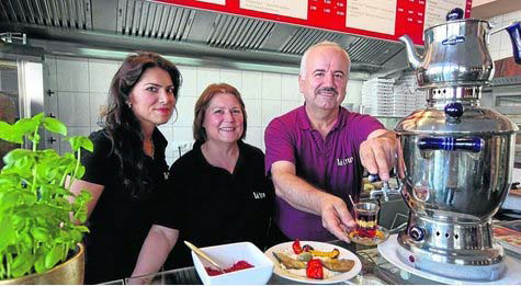 Gastfreundlich: die Familie Dogrul - von links Nihal, Bahtiye und Naci - bewirtet die Gäste in Ihrem Restaurant lá truva. Selbst verzichten sie im Ramadan, der in diesem Jahr noch bis zum 9. September andauert, tagsüber auf jedes Essen und Trinken. Foto: Fischer
